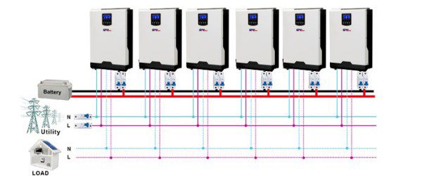 Available from 800w to 2400w, all models in this series come with either MPPT or PWM solar charger and also offer free monitoring on PC which is bundled with purchase.  Stackable feature up to 6 units maximum is available only on 2424LV-HS and 2424LV-MSD, increasing max output capacity up to 2.4KW x 6 = 14.4KW.  Below is a simple diagram illustrating parallel setup, and parallel kit (sold separately) is also required on each inverter unit.