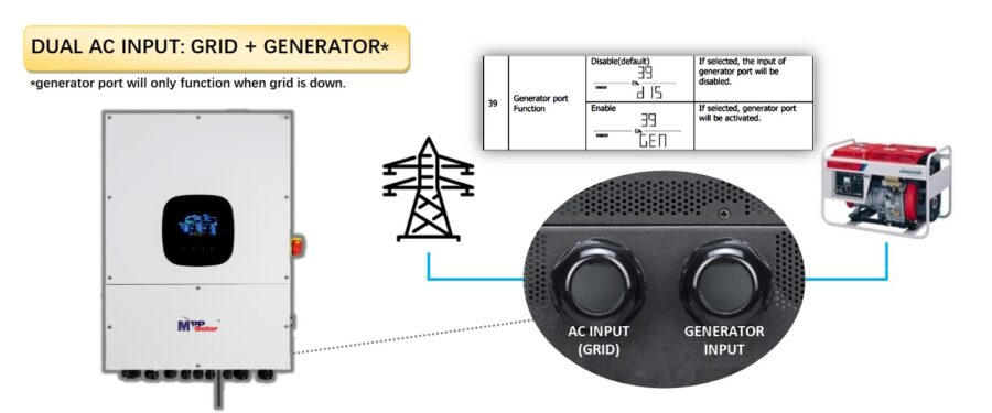 - Generator port will be automatically disabled when grid is available or when inverter is set up for parallel.