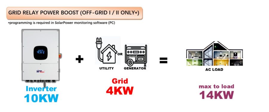 Similar to the MPI Hybrid series (MPI 10K, MPI 12K/15K WP),this model also retains Grid Relay feature and will increase maximum power capacity from 10KW to 15KW (5KW power boost from grid) when this feature is enabled. For more details on this please refer to catalog & user manual.