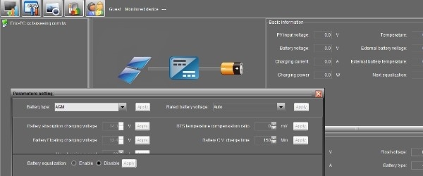 Through the RS232 software interface (RS232-USB adaptor may be used), users can adjust the main charging parameters including absorption voltage, floating voltage, absorption time, equalization voltage & time, and temperature compensation ratio.   A graphical representation of the unit charging is visible and data as well as event logs are stored on PC and can be exported as PDF.